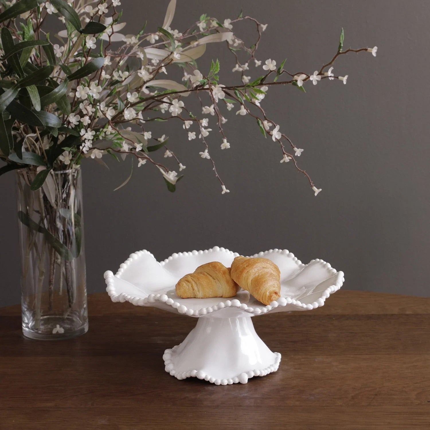Enhanced with lively pearl details, the VIDA Alegria Small Pedestal Cake Plate (White) is the essence of casual elegance in shimmering white melamine. A natural for smaller cakes and other baked goods, the beautifully designed piece is also an elegant surface on which to serve cheese cubes, canapés or other small bites. A unique gift for the baker in your life. The versatile and cleverly designed white cake stand boasts a twist-off pedestal for easy storage. Inverted, the base doubles as a dip bowl when placed atop the round platter. The attractive and generously proportioned cake stand has the luster, heft and look of a ceramic piece. Made of luxury melamine for everyday enjoyment, this piece is ideally suited for indoor and outdoor entertainment.