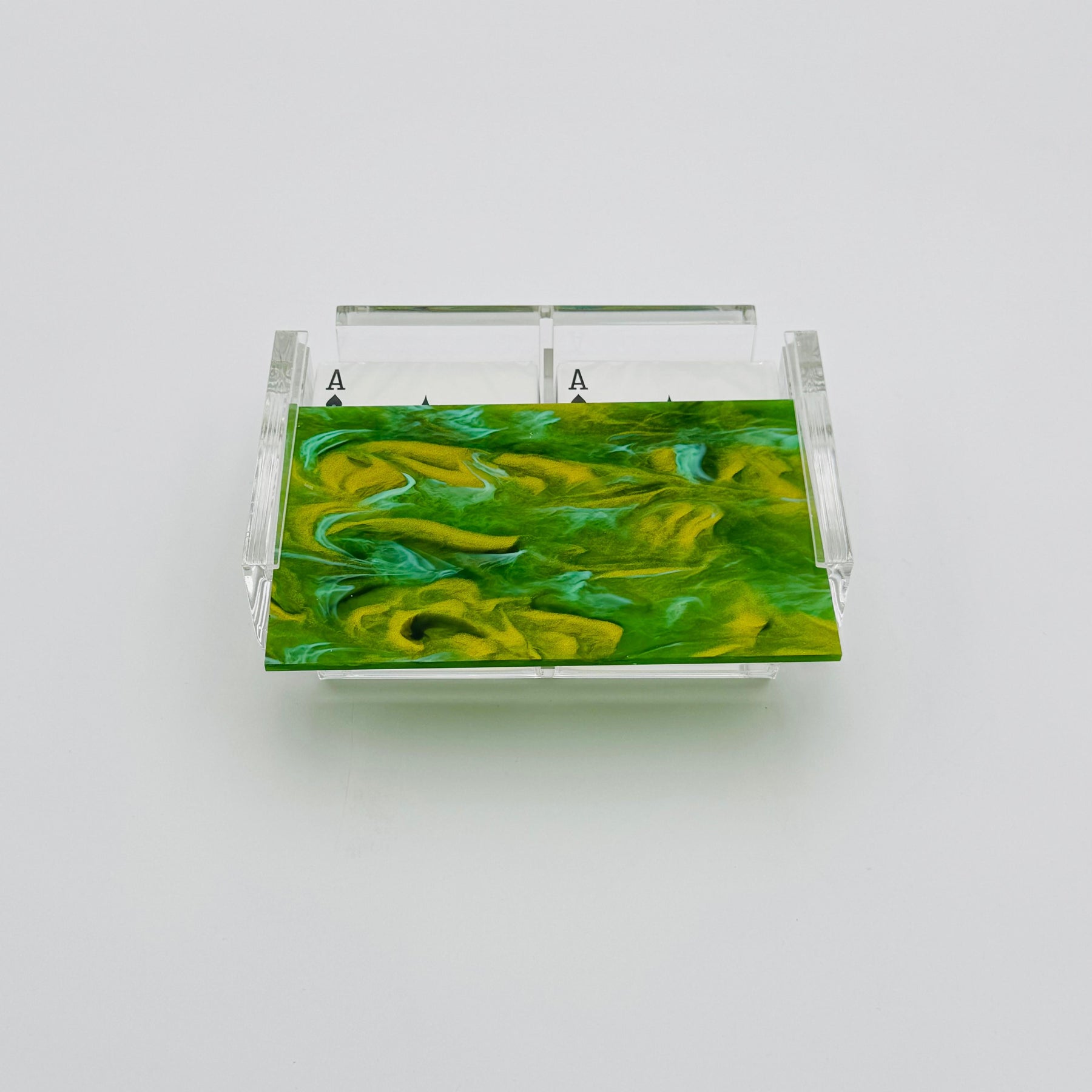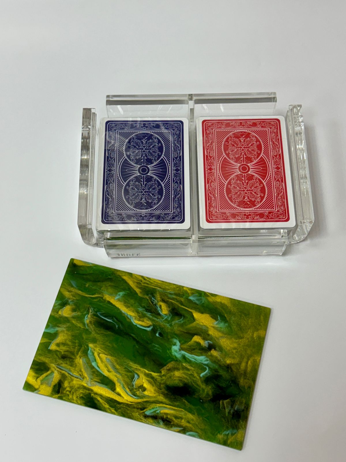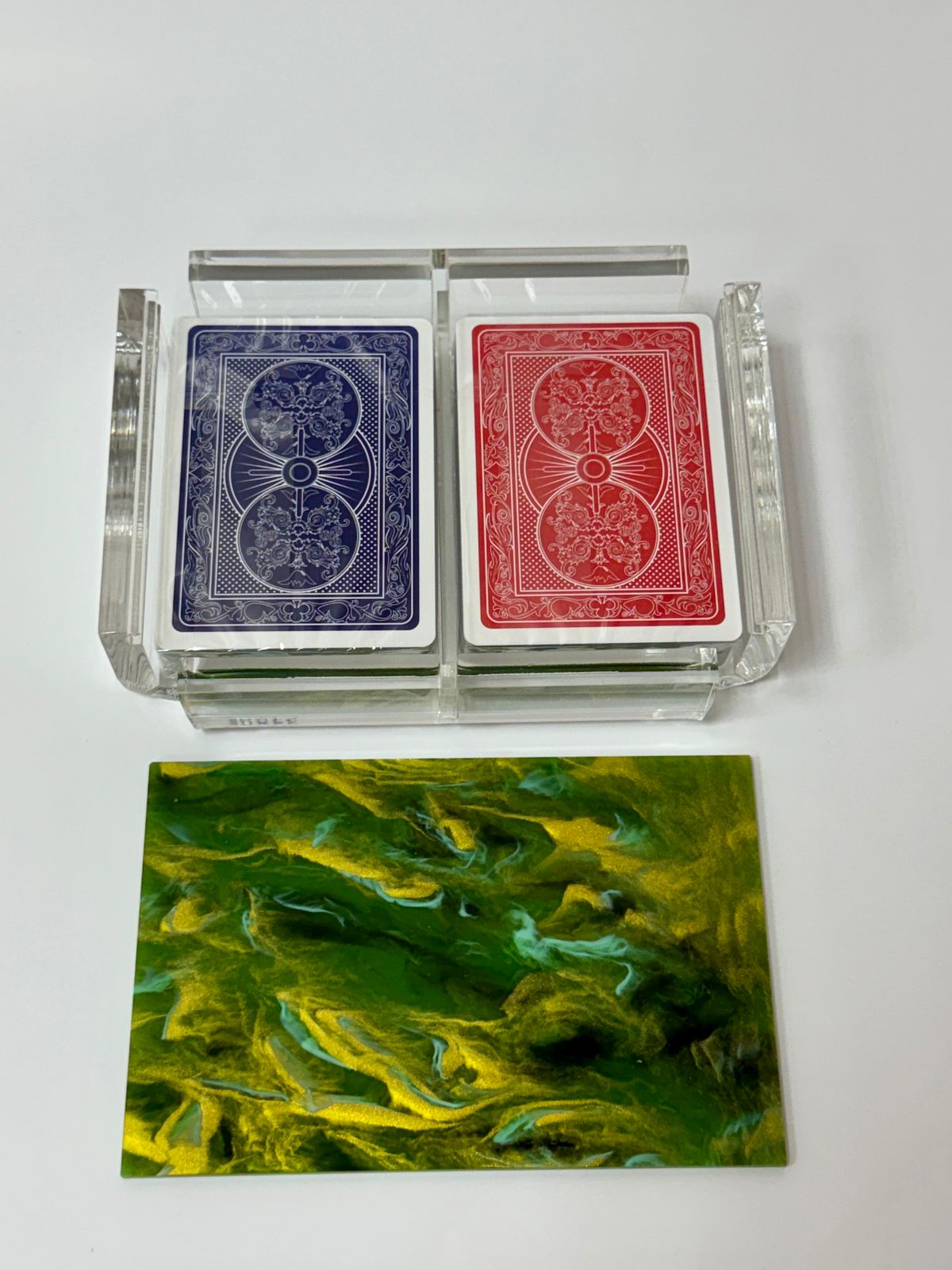 This playing card deck of modern design is handmade in Miami from a single piece of acrylic. All sets come with Bicycle 808 Standard Index playing card decks with blue and red backs. Durable and air cushioned for a great feel no matter what game you play.