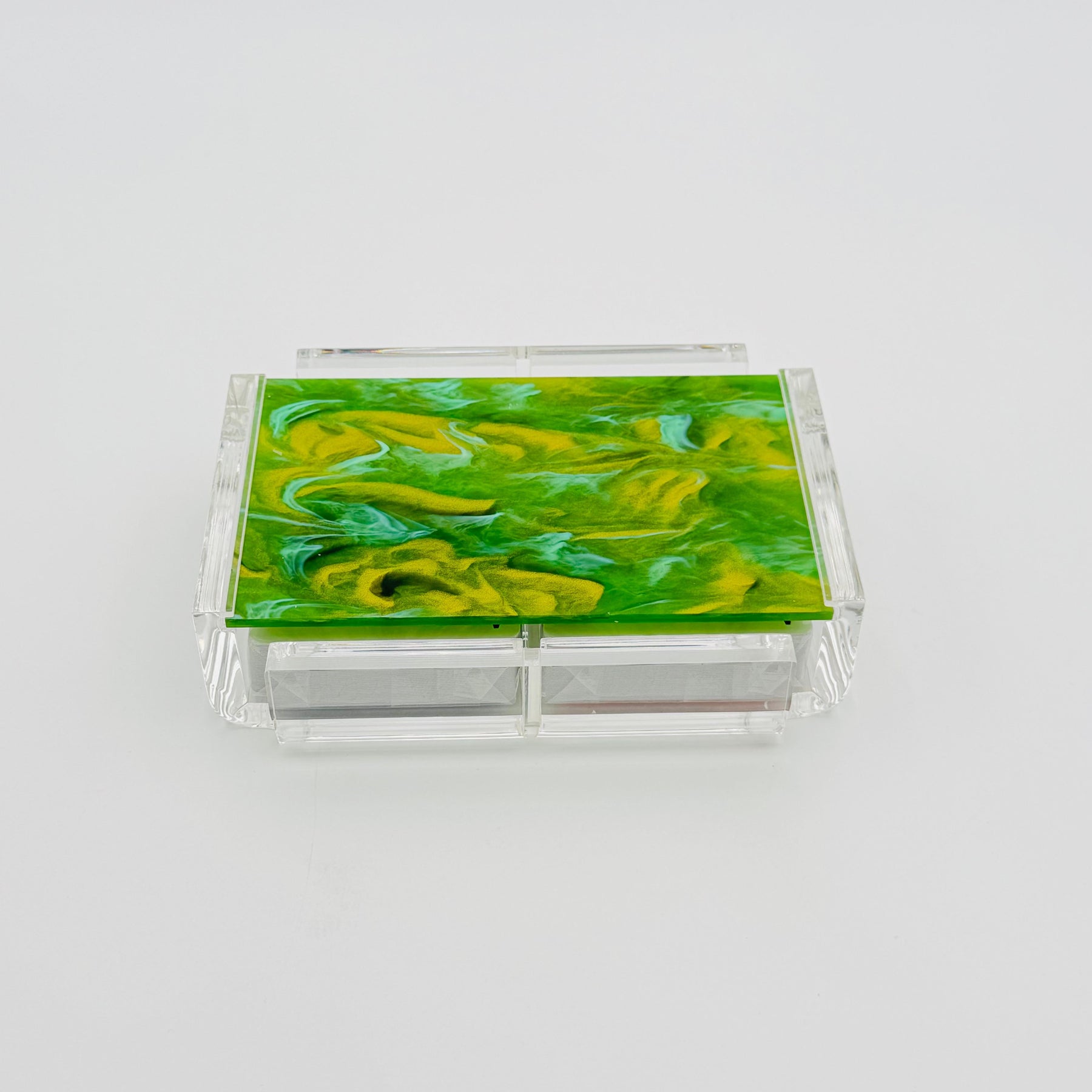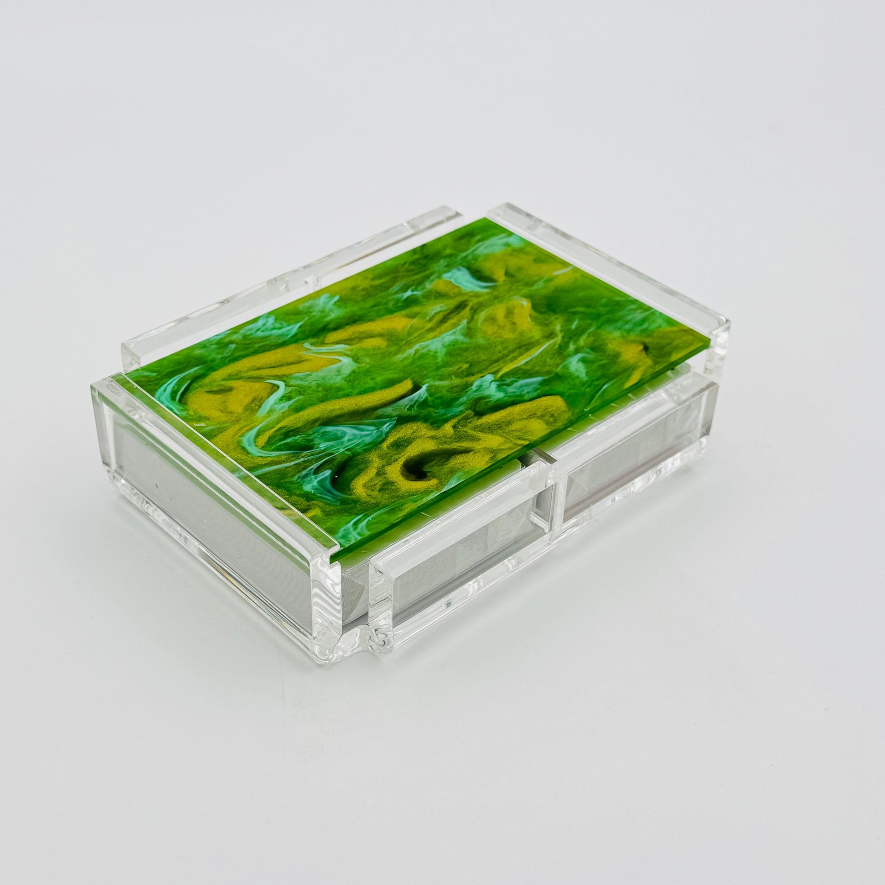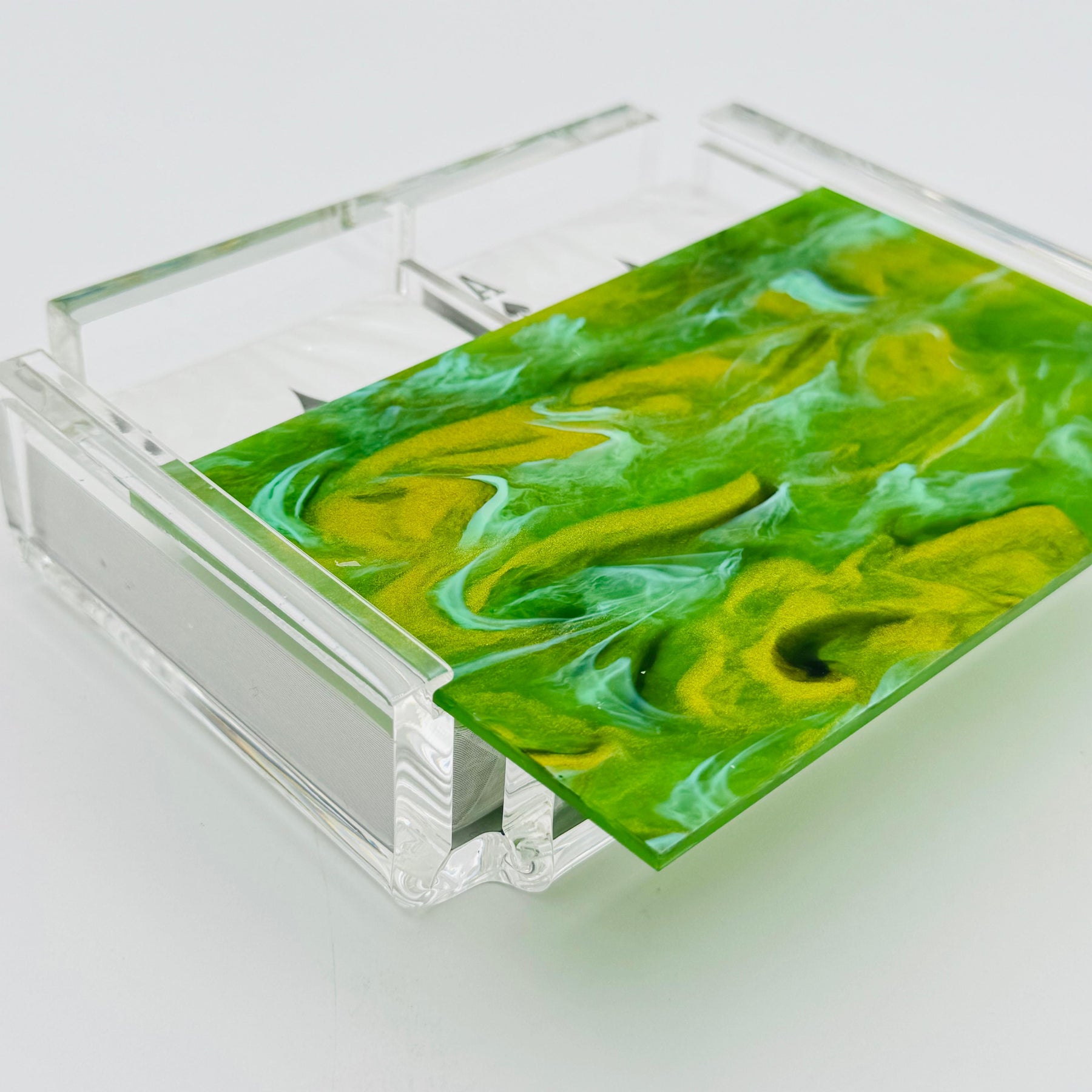 This playing card deck of modern design is handmade in Miami from a single piece of acrylic. All sets come with Bicycle 808 Standard Index playing card decks with blue and red backs. Durable and air cushioned for a great feel no matter what game you play.
